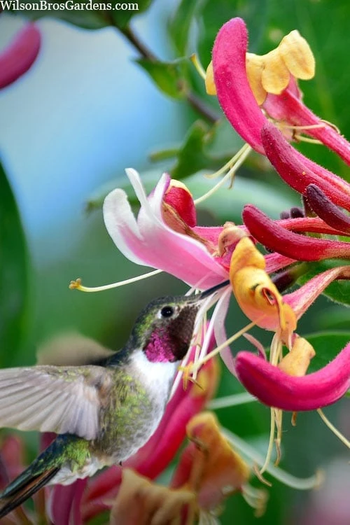 The Serotina Honeysuckle Vine is a recipient of the prestigious Award of Garden Merit for many good reasons. If hummingbirds could vote to award their favorite flowers, this one would be at or near the top of the list. Serotina is way more behaved and has a slower growth rate than other Lonicera species, eventually reaching 8 to 20 feet tall depending on the height of the support structure. In late spring abundant clusters of showy, elongated crimson-red to magenta buds begin forming at the tips of every stem on the vine. In early summer these buds begin opening to deliciously honey-scented tubular flowers that are crimson on the outside with white throats maturing to golden yellow, resulting in a tricolor effect. The flowers keep coming all the way to frost. Following the flowers are an equal abundance of bright red berries the songbirds will enjoy. Both the flowers and berries stand out beautifully against attractive, dark blue-green leaves, which are evergreen in the southern range where winters are mild.